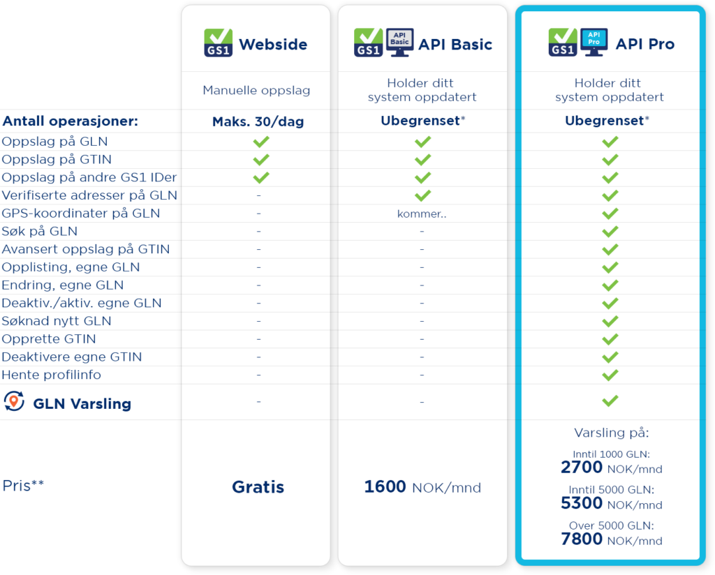 API Pro gir i likhet med API Basic ubegrenset med oppslag mot Verified by GS1 fra eget system, og har flere typer oppslag. Dessuten kan man bli varslet på alle GLN som man har aktive i eget system med GLN Varsling.
